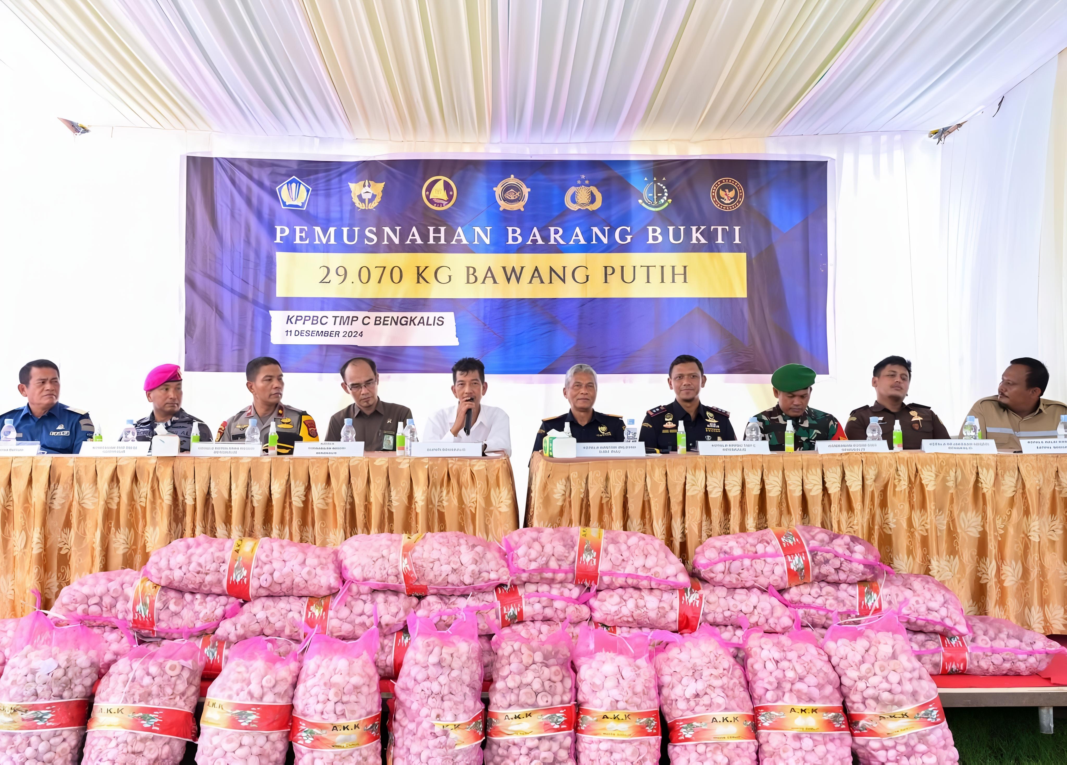 📸 Kantor Pengawasan dan Pelayanan Bea dan Cukai (KPPBC) Tipe Madya Pabean C Bengkalis memusnahkan 29.070 kg bawang putih hasil penyelundupan.