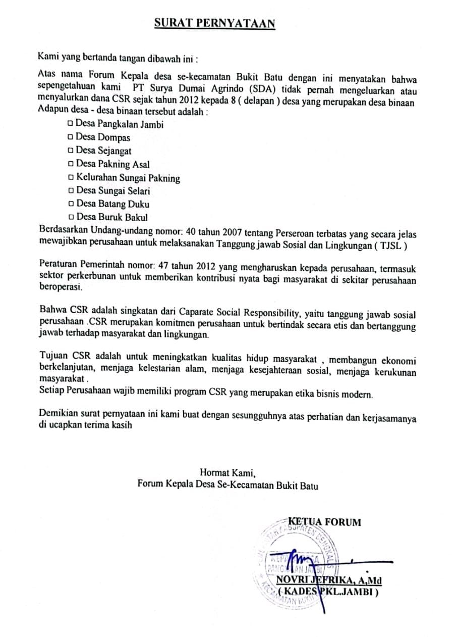 Kekecewaan itu disampaikan Forum Kepala Desa se-Kecamatan Bukit Batu melalui surat pernyataan resmi yang ditandatangani Ketua Forum, Novri Jefrika, yang juga menjabat sebagai Kepala Desa Pangkalan Jambi.