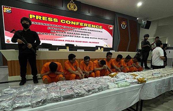 PEKANBARU-Jajaran Direktorat Reserse (Ditres) Narkoba Polda Riau berhasil menangkap 8 anggota sindikat pengedar narkoba internasional, Bersama pelaku disita barang bukti 76 kilogram sabu dan 41.000 butir pil ekstasi.
