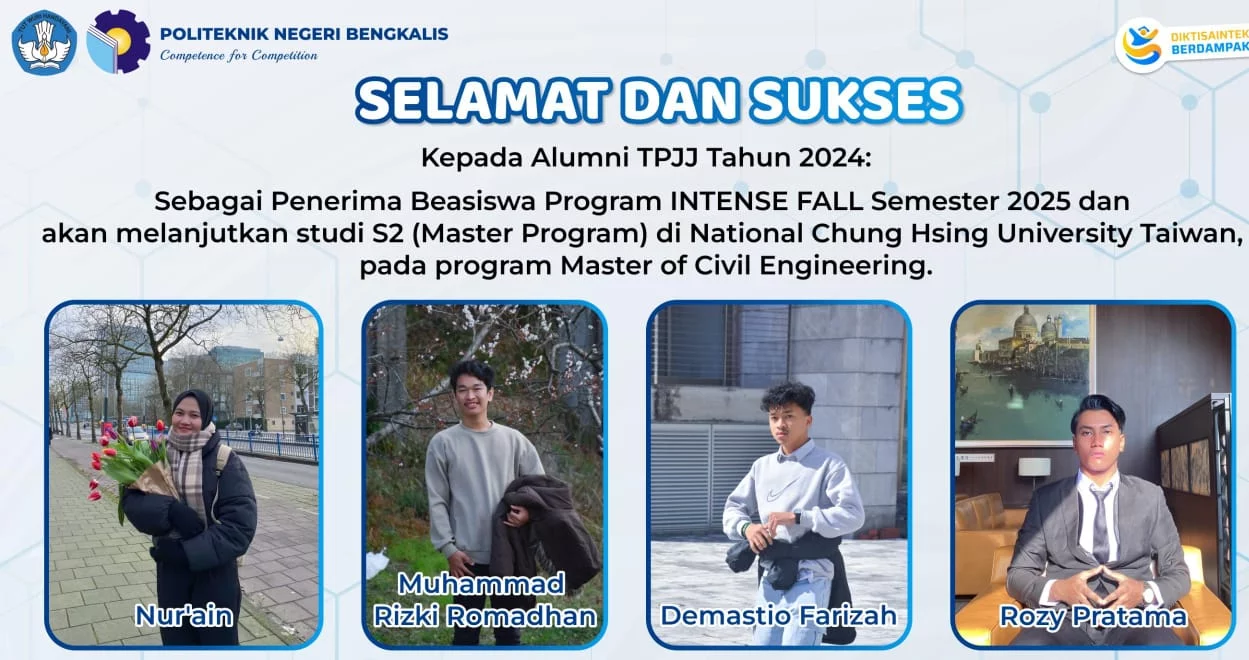 PRODESANEWS.COM | BENGKALIS – Empat alumni vokasi dari pesisir Riau bersiap menempuh babak baru dalam dunia pendidikan global. Rozy Pratama, Nur’ain, Muhammad Rizki Ramadhan, dan Demastio Farizah—lulusan Program Studi Teknik Perancangan Jalan dan Jembatan, Politeknik Negeri Bengkalis (Polbeng)—berhasil diterima sebagai penerima beasiswa penuh untuk studi magister di Taiwan.