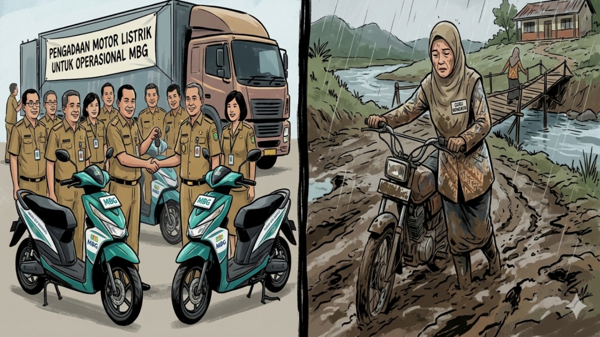 Ketimpangan ini bukan sekadar urusan teknis administrasi, melainkan soal keberpihakan. Satu unit motor operasional MBG senilai Rp42 juta itu, secara kasar, setara dengan total gaji satu tahun untuk puluhan guru honorer di pedalaman yang upahnya masih sering dirapel. Kebijakan ini menunjukkan sebuah paradoks: kita ingin memberi makan bergizi bagi anak-anak agar mereka pintar, namun kita membiarkan para pendidiknya kelelahan dan terlunta-lunta di jalanan tanpa fasilitas yang layak.