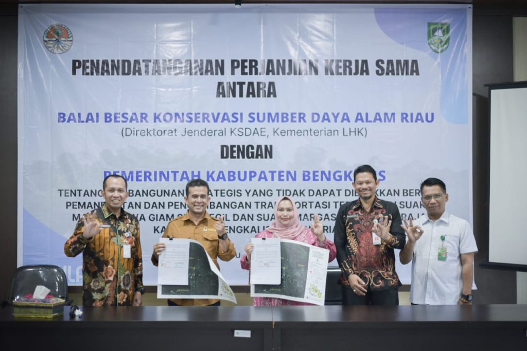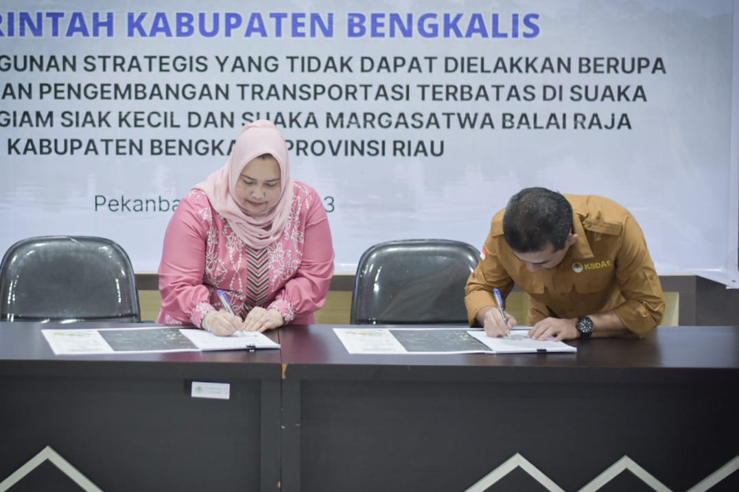 Perjanjian kerjasama dimaksud, yaitu tentang pembangunan strategis yang tidak dapat dielakkan berupa pemanfaatan dan pengembangan transportasi terbatas di Suaka Margasatwa Giam Siak Kecil dan Suaka Margasatwa Balai Raja Kecamatan Pinggir.